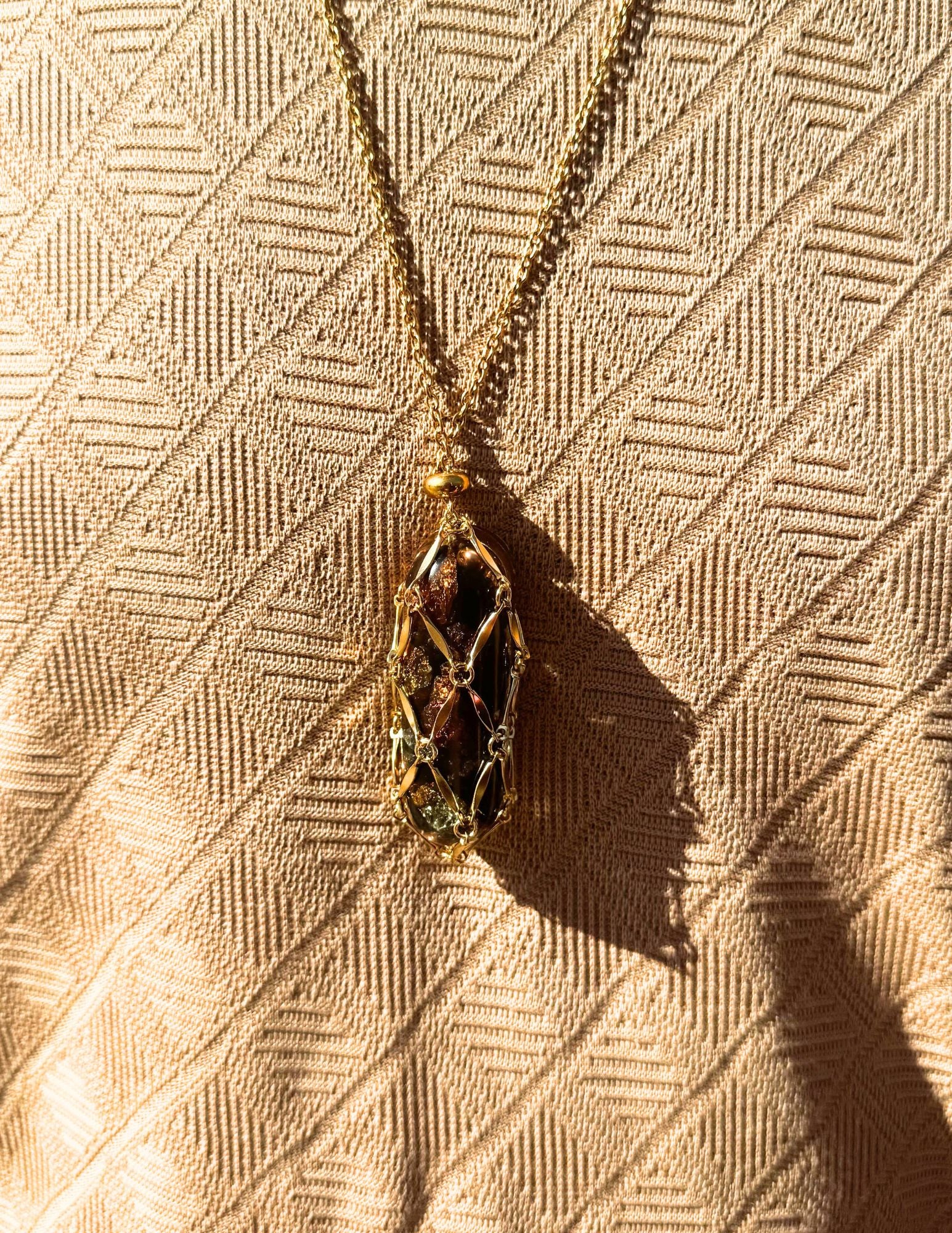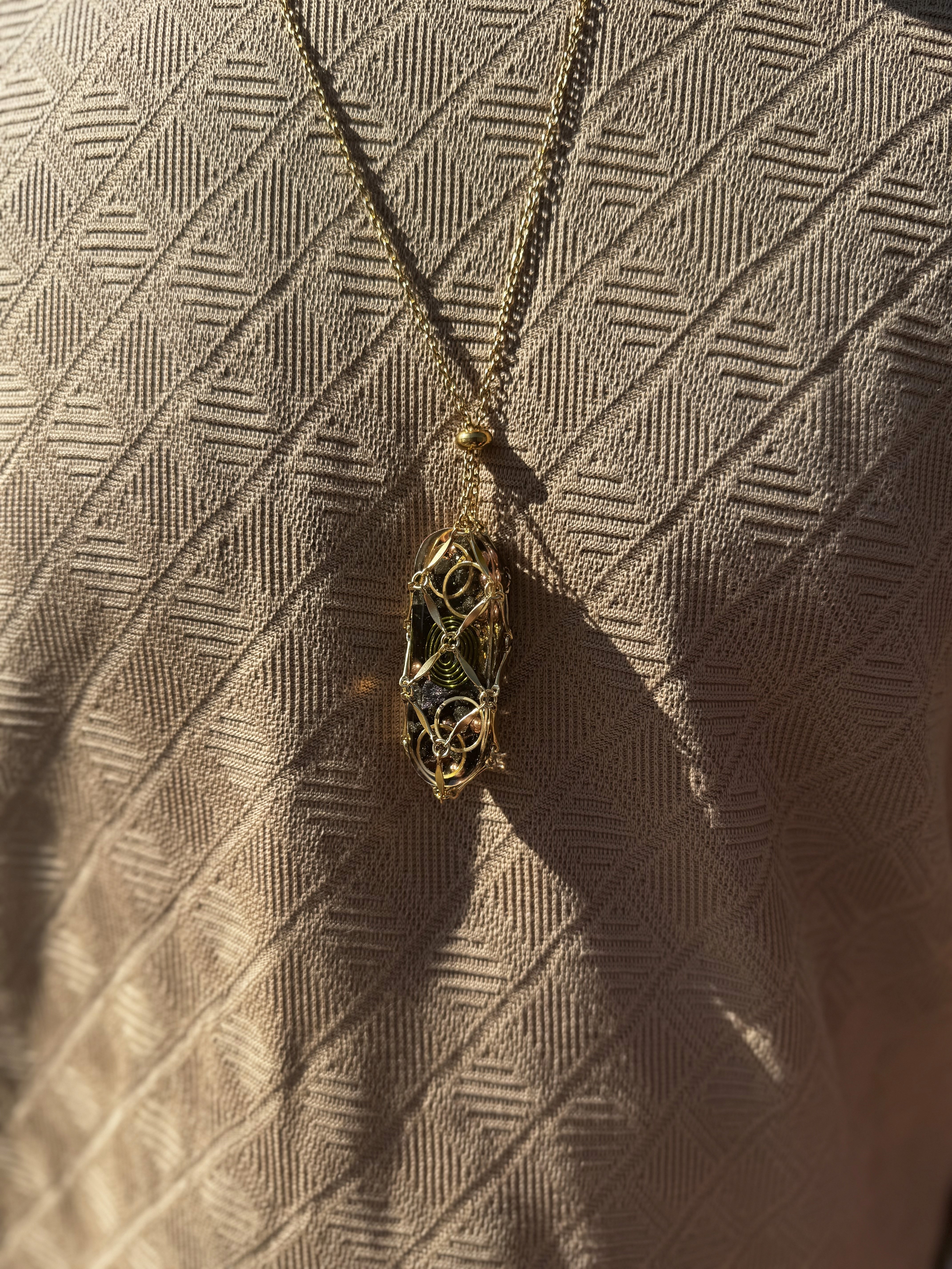 The Orgone Necklace is a handcrafted piece designed to harness and amplify Orgone energy — the vital life force described by Wilhelm Reich. Made with copper, quartz crystals, real Opals, tourmaline, shungite, pyrite, various metals, resin, and a copper Triskelion, it creates a protective field that helps shield the wearer from harmful high-frequency electromagnetic radiation emitted by WiFi routers, 5G towers, and electronic devices.